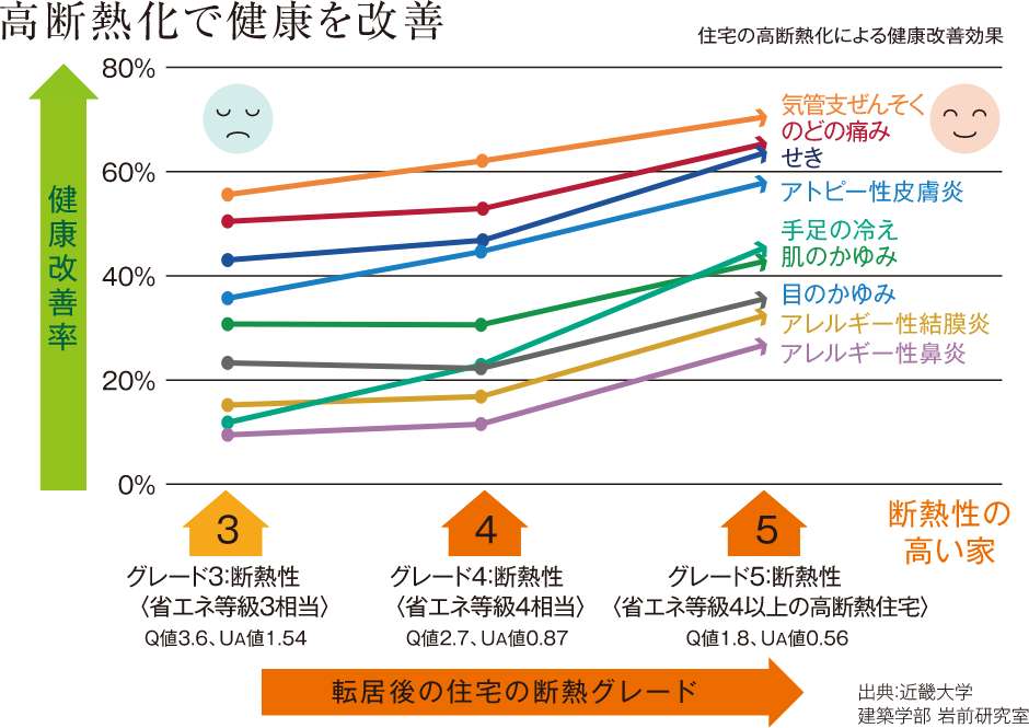 いつまでも健康で快適な生活をおくるためには、多くの時間を過ごす居住空間の室内環境にこだわることが大切です。GLホームの高気密・高断熱住宅では、冬は暖められた室内空気を外に逃がさず、夏は外の暑さをシャットアウト。そのためわずかな冷暖房で快適な室温を保ち、高い省エネ効果を発揮します。また、高断熱化により気管支ぜんそく・アトピー性皮膚炎など身体の悩みも改善します。